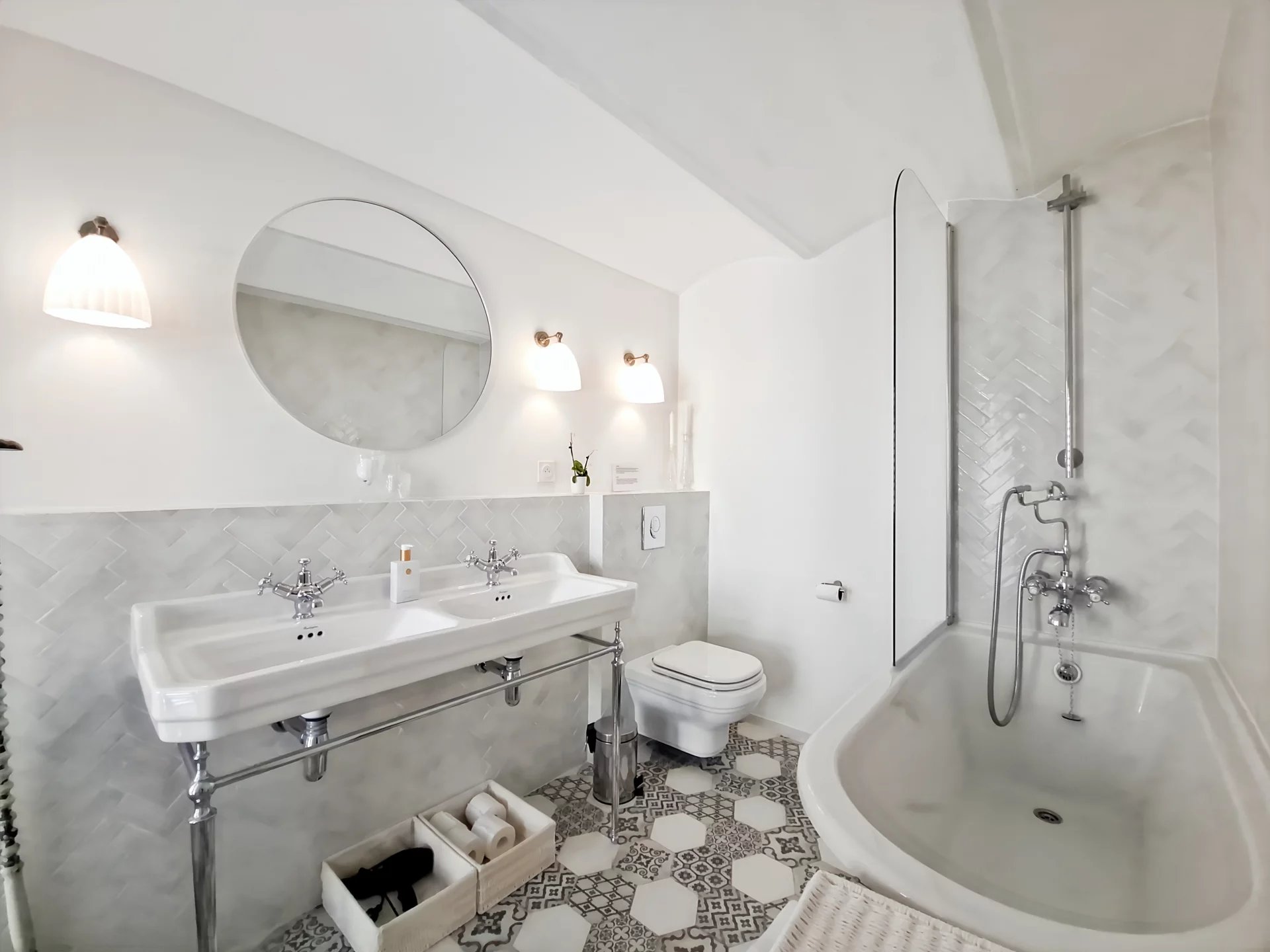 Appartement de 3/4 pièces comprenant un séjour, une cuisine ouverte, 2 grandes chambres et une 3eme plus petite, 2 salles d’eau avec wc et une salle de bain avec wc.