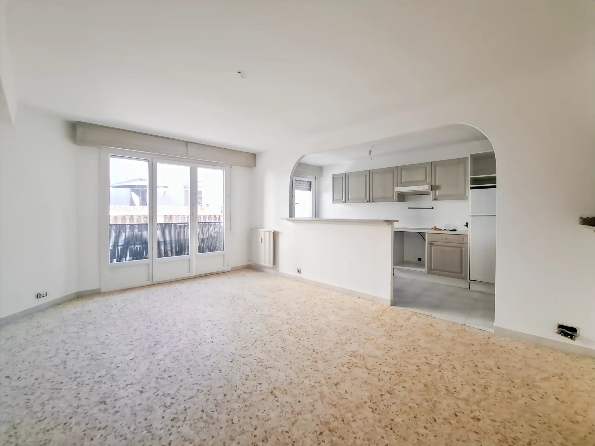 Cet appartement à rafraîchir comprend une entrée, un salon/séjour, une cuisine ouverte, deux chambres, une salle de bain et wc.